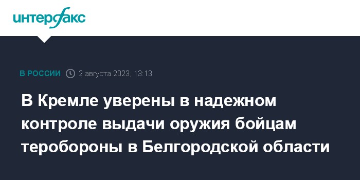Москва. 2 августа. INTERFAX.RU - В Кремле не сомневаются в том, что при выдаче оружия бойцам территориальной обороны в Белгородской области работают механизмы контроля, заявил пресс-секретарь президента РФ Дмитрий Песков.