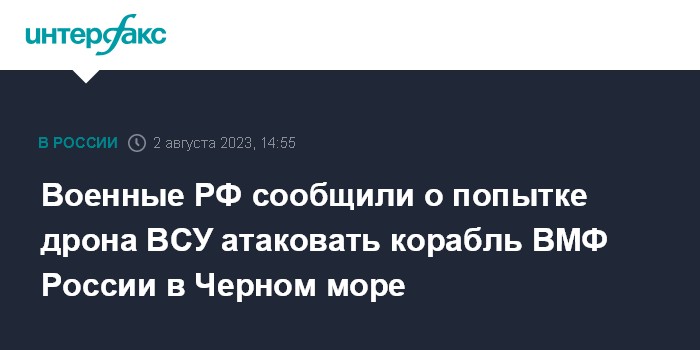 Москва. 2 августа. INTERFAX.RU - Вооруженные силы Украины (ВСУ) попытались атаковать морским беспилотным катером российский военный корабль, сопровождавший гражданский транспорт в юго-западной части Черного моря, заявил официальный представитель Минобороны РФ Игорь Конашенков.