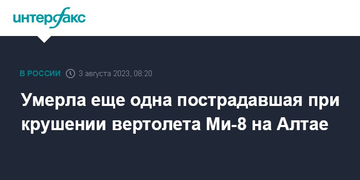 Москва. 3 августа. INTERFAX.RU - В ожоговом центре в Барнауле умерла вторая женщина из трех пострадавших в недавнем крушении вертолета Ми-8, которых перевезли на лечение из Республики Алтай в Алтайский край, сообщили в пресс-службе краевого Минздрава.