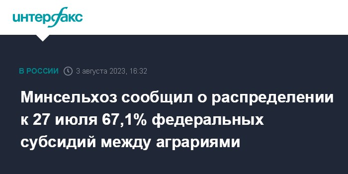 Минсельхоз сообщил о распределении к 27 июля 67,1% федеральных субсидий между аграриями