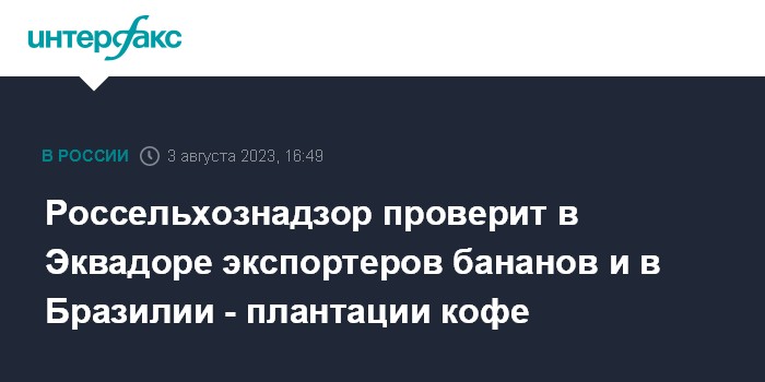 Москва. 3 августа. INTERFAX.RU - Россельхознадзор планирует проинспектировать в Эквадоре систему контроля за производством, складированием, упаковкой бананов и цветов, отправляемых в Россию, а в Бразилии так же проверить поставщиков кофе.