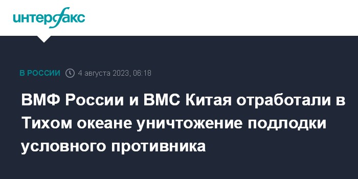 Москва. 4 августа. INTERFAX.RU - Экипажи кораблей российского ВМФ и ВМС Китая при совместном патрулировании в юго-западной части Берингова моря отработали поиск и уничтожение подводной лодки условного противника, сообщил Тихоокеанский флот (ТОФ).