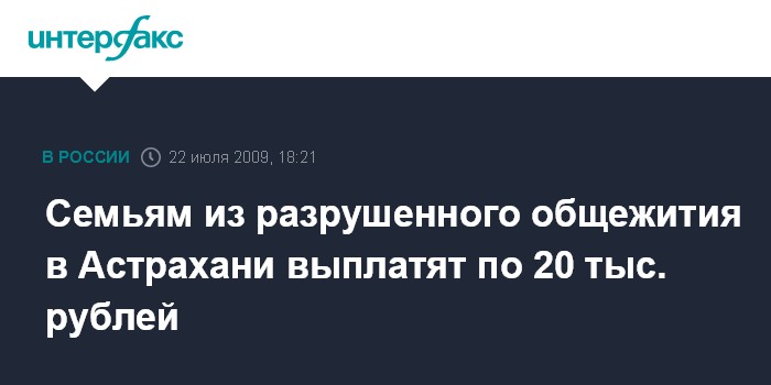 Ростов-на-Дону. 22 июля. INTERFAX.RU - Из бюджета Астрахани будет выплачена материальная помощь в размере 20 тыс. рублей пострадавшим от частичного обрушения общежития по улице Савушкина.