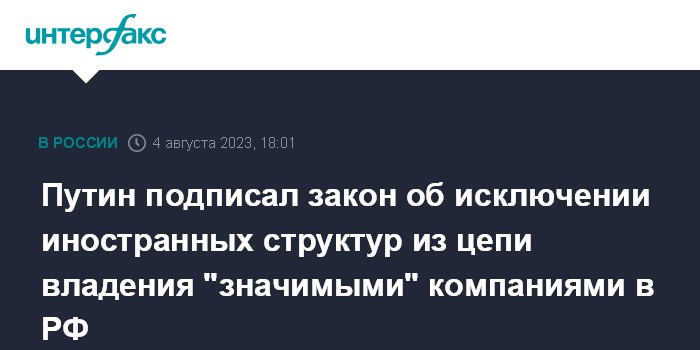 Москва. 4 августа. INTERFAX.RU - Президент РФ Владимир Путин подписал закон, позволяющий российским бенефициарам экономически значимых отечественных организаций (ЭЗО) через суд получать напрямую дивиденды от них, а также акции и доли в прямое владение, обойдя иностранные структуры из "недружественных" юрисдикций.