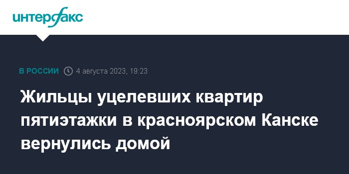 Москва. 4 августа. INTERFAX.RU - Часть жильцов многоквартирного дома в Канске Красноярского края, где в пятницу произошел взрыв бытового газа, вновь заселилась в свои квартиры, сообщает пресс-служба городской администрации.