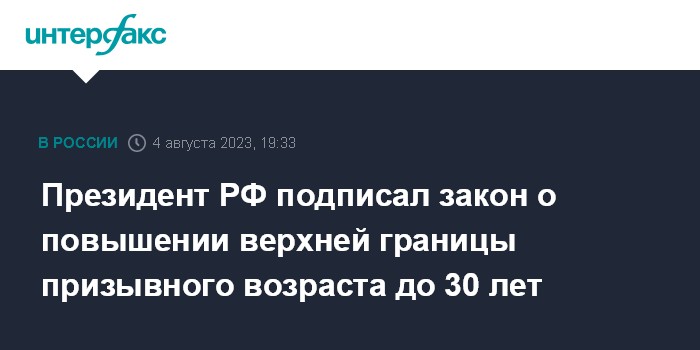Москва. 4 августа. INTERFAX.RU - Президент РФ Владимир Путин подписал закон, согласно которому возраст призыва граждан на военную службу в РФ с 1 января 2024 года составит от 18 до 30 лет.