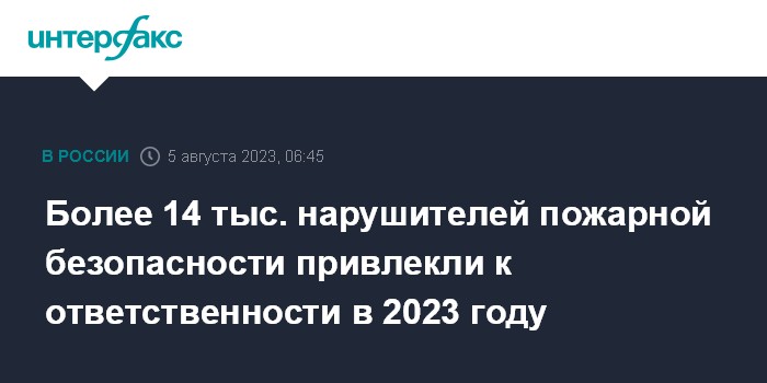 Москва. 5 августа. INTERFAX.RU - Свыше 14 тыс. физических и порядка трех тысяч должностных и юридических лиц привлечены к административной ответственности за нарушение требований пожарной безопасности в этом году, заявил глава МЧС РФ Александр Куренков.