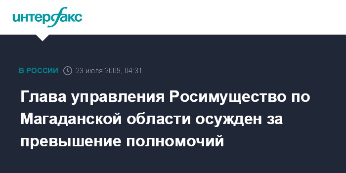 Магадан. 23 июля. ИНТЕРФАКС-ДАЛЬНИЙ ВОСТОК - Руководитель территориального управления Федерального агентства по управлению федеральным имуществом по Магаданской области Евгений Антощенков признан судом виновным в превышении должностных полномочий (ч.1 ст.286 УК РФ).