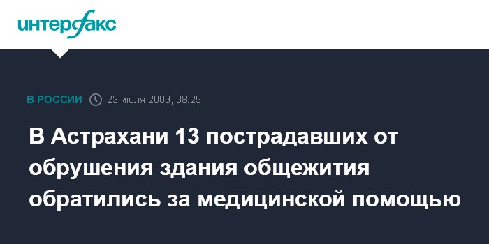 Москва. 23 июля. INTERFAX.RU - Медицинская помощь оказана 13 пострадавшим в результате обрушения двух подъездов здания общежития в городе Астрахань, сообщили агентству "Интерфакс-Юг" в оперативном штабе по ликвидации последствий происшествия в среду.
