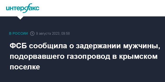 Москва. 9 августа. INTERFAX.RU - ФСБ РФ сообщает о задержании мужчины, устроившего по заданию украинских спецслужб подрыв газопровода в крымском поселке Кореиз в июне этого года.