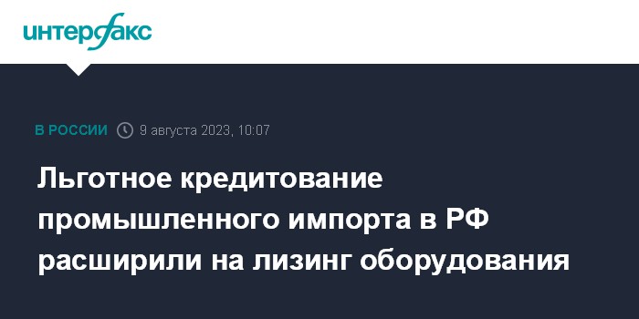Москва. 9 августа. INTERFAX.RU - Правительство расширило программу поддержки импорта важной для экономики продукции, в рамках которой промпредприятия могли привлекать льготные кредиты на закупку материалов и оборудования из-за рубежа. Теперь программа будет распространяться также на лизинг, сообщает сайт правительства.