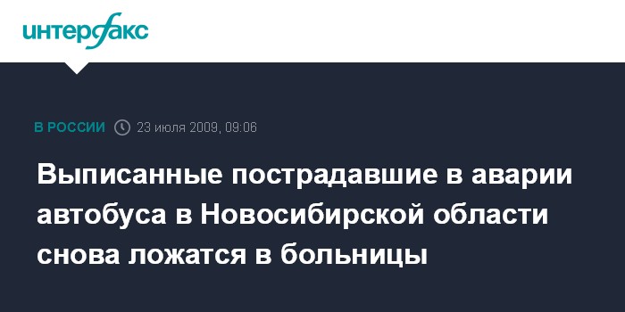 Москва. 23 июля. INTERFAX.RU - Несколько пострадавших в ДТП в Новосибирской области, которых выписали из больниц, возвращаются в стационары для продолжения лечения.
