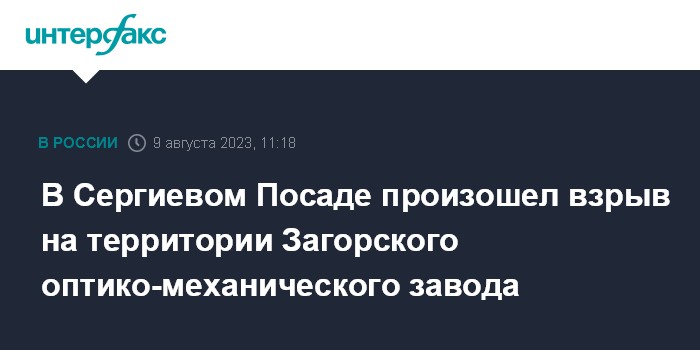 Москва. 9 августа. INTERFAX.RU - В Сергиевом Посаде произошел взрыв на Загорском оптико-механическом заводе, сообщили в управлении МЧС по Московской области.