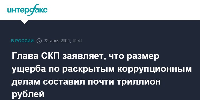 Москва. 23 июля. INTERFAX.RU - Сумма ущерба, причиненного коррупционерами по расследованным уголовным делам, приблизилась к 1 трлн. рублей, сообщил глава СКП РФ Александр Бастрыкин.