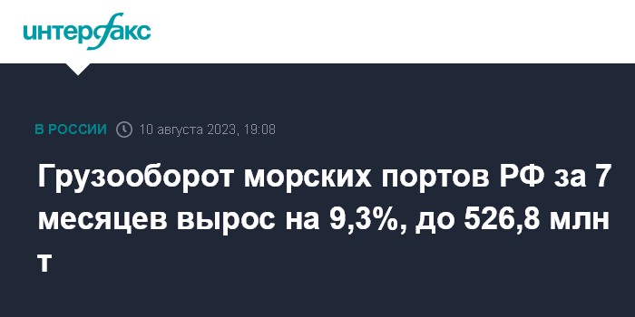 Москва. 10 августа. INTERFAX.RU - Грузооборот морских портов РФ в январе-июле 2023 года увеличился на 9,3% по сравнению с тем же периодом 2022 года, до 526,8 млн тонн, сообщило Федеральное агентство морского и речного транспорта (Росморречфлот).