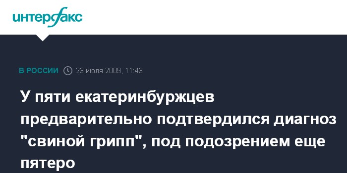 Москва. 23 июля. INTERFAX.RU - У пятерых жителей Екатеринбурга, госпитализированных с подозрением на грипп A/H1N1, предварительно подтвержден этот диагноз.