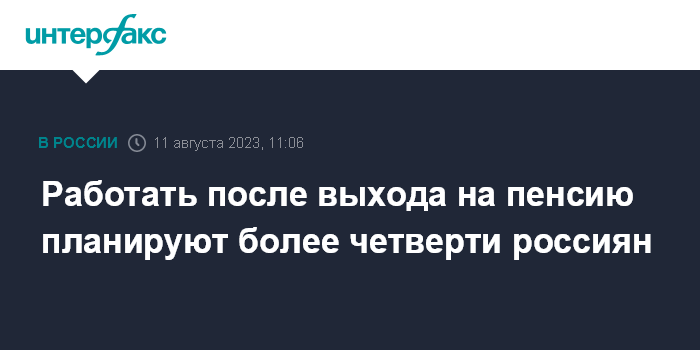 Москва. 11 августа. INTERFAX.RU - Работать или подрабатывать после выхода на пенсию собираются 27% россиян, среди сограждан в возрасте до 34 лет такие планы почти у каждого третьего (32%), свидетельствуют данные опроса Исследовательского центра портала SuperJob.ru.