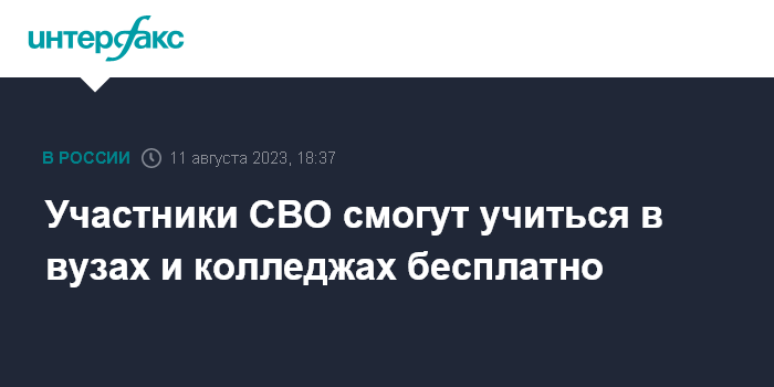 Москва. 11 августа. INTERFAX.RU - Студенты колледжей и вузов, участвовавшие в специальной военной операции, получат возможность перевестись на бесплатную форму обучения, даже несмотря на отсутствие вакантных мест, решили в правительстве.