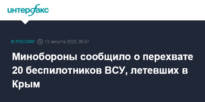 Москва. 12 августа. INTERFAX.RU - Российские военные заявили, что предотвращена атака 20 украинских беспилотников на объекты в Крыму.