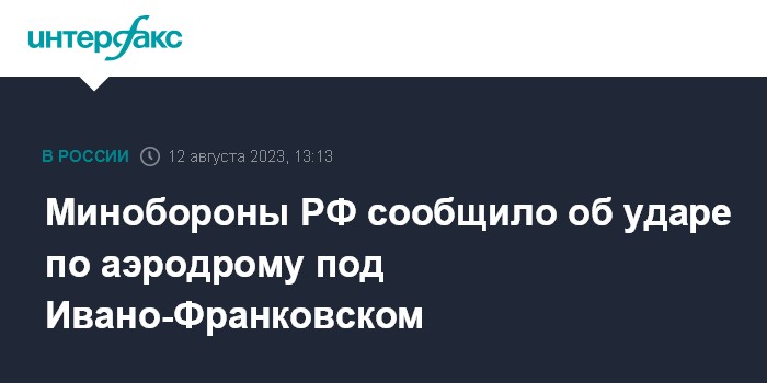 Москва. 12 августа. INTERFAX.RU - Групповой удар высокоточным оружием большой дальности воздушного базирования нанесен по аэродрому вооруженных сил Украины в Ивано-Франковской области, сообщил официальный представитель министерства обороны РФ Игорь Конашенков на брифинге в субботу.