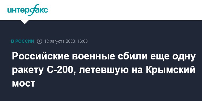 Москва. 12 августа. INTERFAX.RU - Министерство обороны РФ сообщило, что днем 12 августа сбита еще одна украинская ракета С-200, которая летела на Крымский мост.