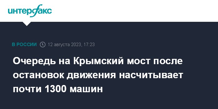 Москва. 12 августа. INTERFAX.RU - В очередях перед обязательным досмотром на Крымский мост с двух сторон скопилось 1272 автомобиля после двух перекрытий движения из-за ракетных атак, сообщает телеграм-канал, освещающий ситуацию на автомобильных подходах к мосту.