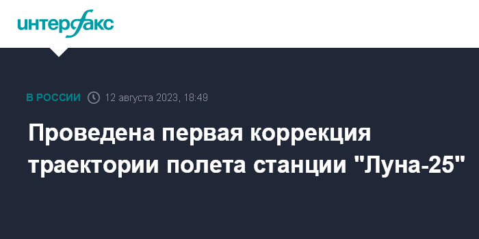 Москва. 12 августа. INTERFAX.RU - Автоматическая межпланетная станция "Луна-25" провела первую коррекцию траектории перелета к естественному спутнику Земли, сообщает пресс-служба "Роскосмоса" в субботу.
