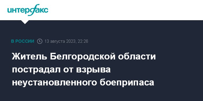 Москва. 13 августа. INTERFAX.RU - Житель поселка Борисовка получил осколочные ранения в результате взрыва неустановленного боеприпаса, сообщил губернатор Белгородской области Вячеслав Гладков.