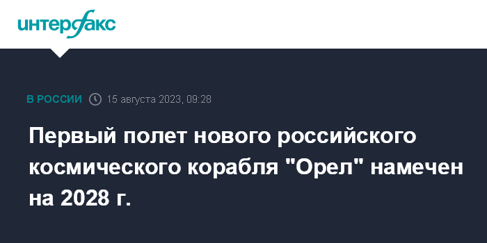 Москва. 15 августа. INTERFAX.RU - Первый запуск перспективного транспортного корабля нового поколения (ПТК НП) "Орел" на Российскую орбитальную станцию (РОС) состоится в 2028 году с космодрома Восточный, сообщил "Интерфаксу" главный конструктор РОС Владимир Кожевников.