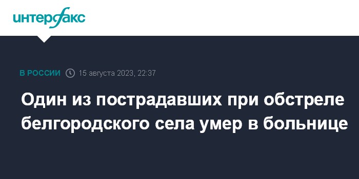 Москва. 15 августа. INTERFAX.RU - Губернатор Белгородской области Вячеслав Гладков сообщил о смерти мужчины, получившего тяжелые ранения при обстреле Новой Таволжанки во вторник днем.