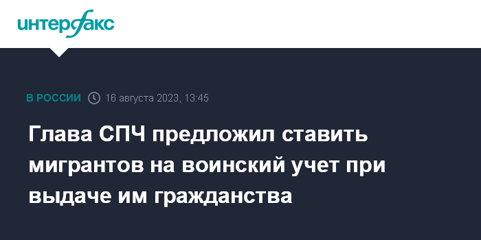Москва. 16 августа. INTERFAX.RU - Председатель Совета при президенте по развитию гражданского общества и правам человека Валерий Фадеев предложил синхронизировать выдачу мигрантам российского паспорта и постановку на воинский учет.