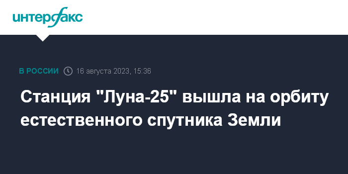 Москва. 16 августа. INTERFAX.RU - Автоматическая межпланетная станция "Луна-25" вышла на орбиту естественного спутника Земли, все системы работают штатно, сообщили в "Роскосмосе".