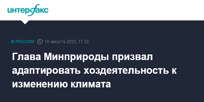 Москва. 16 августа. INTERFAX.RU - Россия подвержена негативному влиянию климатических изменений, однако сможет успешно нивелировать их при реализации мер по адаптации всех сфер хозяйственной деятельности. Такое мнение озвучил министр природных ресурсов и экологии Александр Козлов в ходе доклада президенту РФ Владимиру Путину.