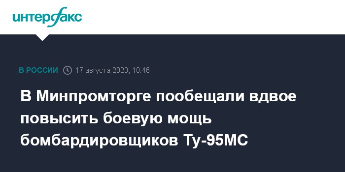 Москва. 17 августа. INTERFAX.RU - Боевая мощность стратегических бомбардировщиков Ту-95МС в текущем году вдвое будет увеличена за счет двигателей, заявил журналистам замглавы Минпромторга РФ Олег Бочаров в ходе посещения "ОДК-Кузнецов" в Самаре.