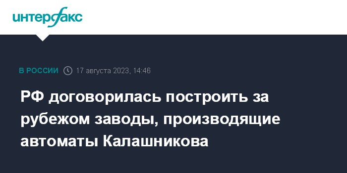 Москва. 17 августа. INTERFAX.RU - "Рособоронэкспорт" сообщил о достижении договорённостей о создании производств автоматов Калашникова на территории других стран.
