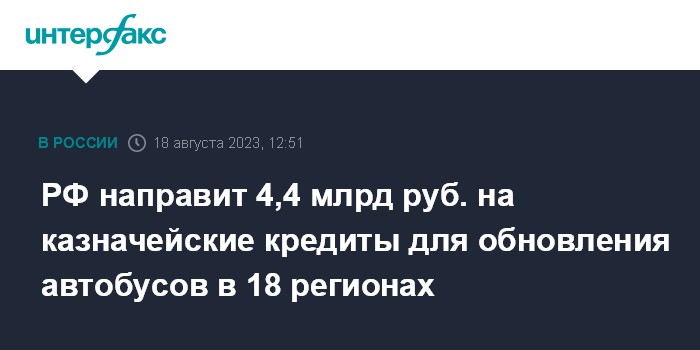 Москва. 18 августа. INTERFAX.RU - Дополнительные 4,4 млрд рублей будут направлены на обновление общественного транспорта в 18 российских регионах через механизм специальных казначейских кредитов, сообщила пресс-служба правительства РФ в пятницу.