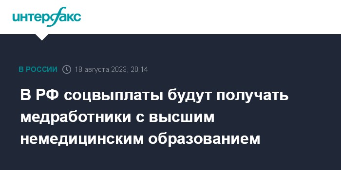 Москва. 18 августа. INTERFAX.RU - Правительство расширило перечень категорий медработников, получающих специальные социальные выплаты, они будут распространяться и на медицинских работников с высшим немедицинским образованием.