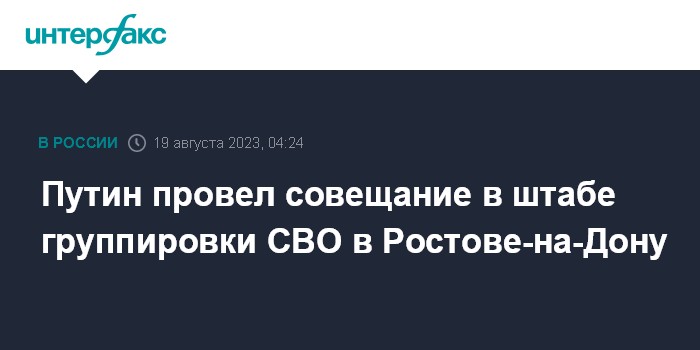 Москва. 19 августа. INTERFAX.RU - Президент РФ Владимир Путин провел совещание в штабе группировки СВО в Ростове-на-Дону, сообщили в Кремле.