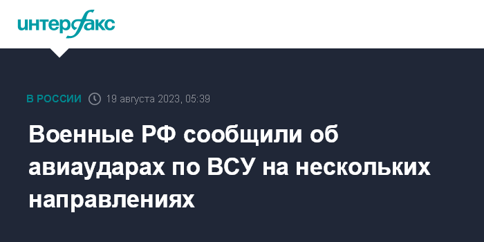 Москва. 19 августа. INTERFAX.RU - Российские штурмовики нанесли авиаудары по подразделениям вооруженных сил Украины (ВСУ) на пяти направлениях на территории Донецкой народной республики, заявил начальник пресс-центра группировки "Юг" Вадим Астафьев.