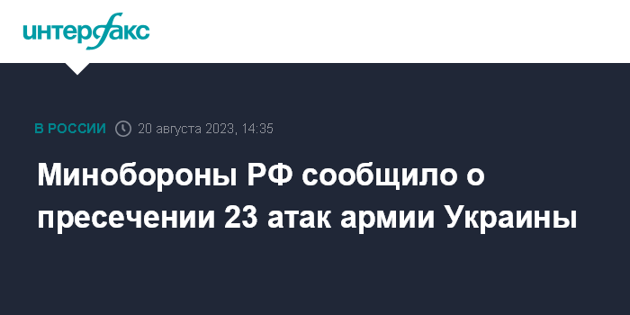 Москва. 20 августа. INTERFAX.RU - Министерство обороны России заявило, что на запорожском, донецком и купянском направлениях за сутки отбиты 23 атаки вооруженных сил Украины (ВСУ).