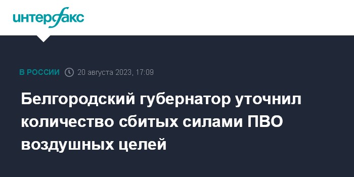 Москва. 20 августа. INTERFAX.RU - Три воздушных цели были сбиты средствами ПВО в Белгородской области, сообщил в воскресенье губернатор региона Вячеслав Гладков.