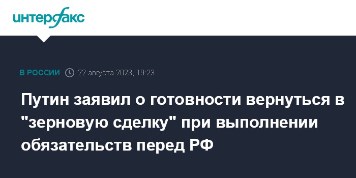 Москва. 22 августа. INTERFAX.RU - Президент РФ Владимир Путин вновь повторил, что Россия готова вернуться в "зерновую сделку" только в случае реального выполнения всех обязательств перед РФ.