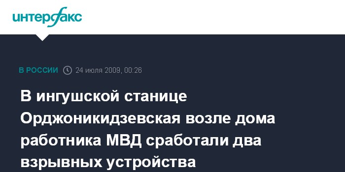 Ростов-на-Дону. 24 июля. ИНТЕРФАКС-ЮГ - Два самодельных взрывных устройства сработали возле дома сотрудника республиканского МВД Ингушетии в станице Орджоникидзевская, жертв и пострадавших нет.
