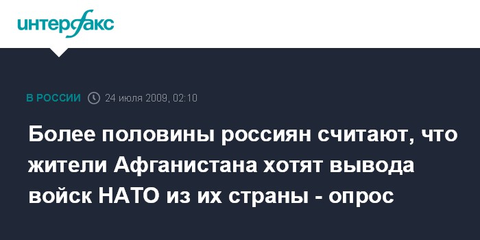 Вашингтон. 24 июля. ИНТЕРФАКС - Большинство жителей планеты считают, что афганцы хотели бы, чтобы коалиционные войска НАТО покинули территорию их страны, говорится в докладе, опубликованном организацией "Уорлд паблик опиньон", основанном на результатах опроса, проведенного в 20 государствах.