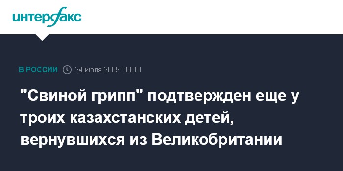 Москва. 24 июля. INTERFAX.RU - Еще у трех казахстанских детей, вернувшихся в Астану после учебы в Лондоне, подтверждено заболевание вирусом гриппа A/H1N1.