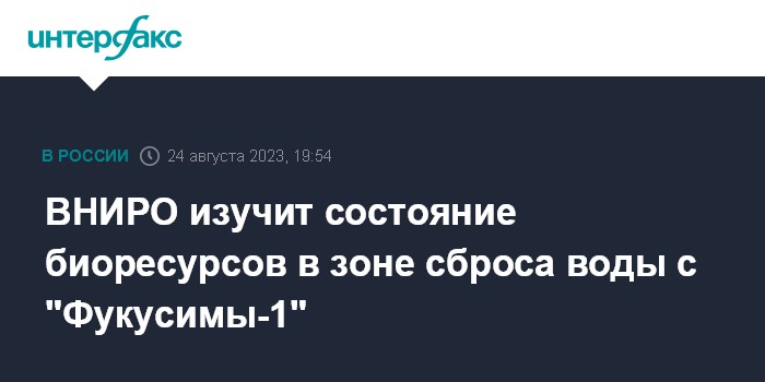 Москва. 24 августа. INTERFAX.RU - Всероссийский НИИ рыбного хозяйства и океанографии (ВНИРО) проведет комплексные мониторинговые исследования для оценки состояния водных биоресурсов в зоне распространения технической воды, сброшенной с атомной электростанции "Фукусима-1".