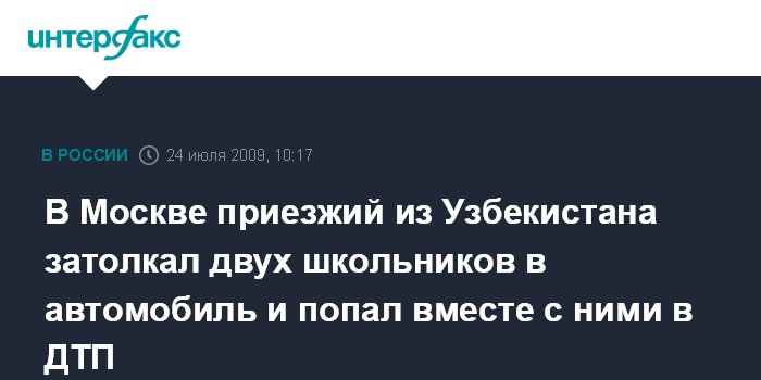 Москва. 24 июля. INTERFAX.RU - На юго-востоке столицы гражданин Узбекистана нанес побои двум школьникам, насильно посадил их в автомобиль, а затем попал в ДТП, сообщил "Интерфаксу" источник в правоохранительных органах города в пятницу.