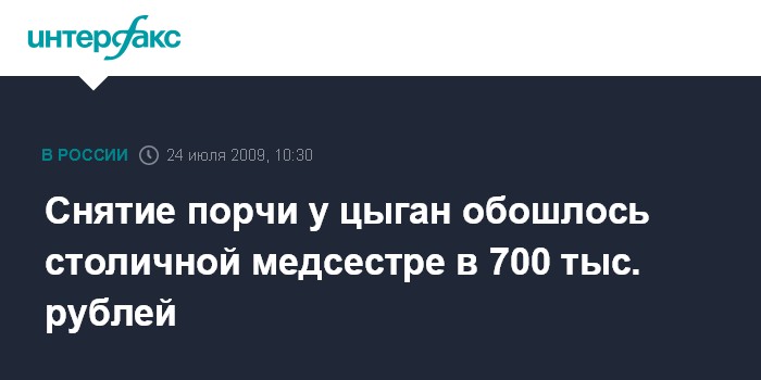 Москва. 24 июля. INTERFAX.RU - На северо-западе Москвы цыгане под предлогом снятия порчи похитили у медсестры деньги и драгоценности на 700 тыс. рублей, сообщил "Интерфаксу" источник в правоохранительных органах города в пятницу.