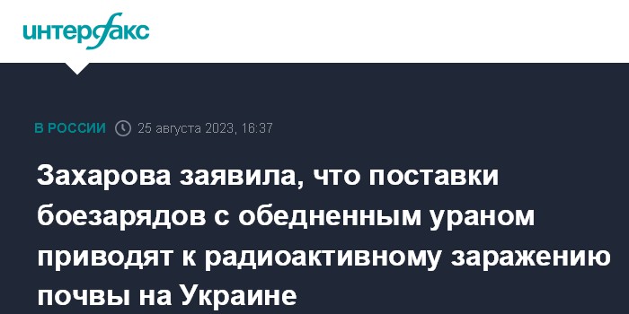Москва. 25 августа. INTERFAX.RU - Официальный представитель МИД РФ Мария Захарова заявила, что поставки боеприпасов с обедненным ураном на Украину приводят к радиоактивному заражению почвы в этой стране.