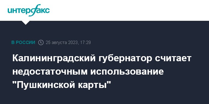 Москва. 25 августа. INTERFAX.RU - В Калининградской области половина молодежи не получила еще "Пушкинскую карту", проект требует более активного продвижения возможностей карты, считает губернатор региона Антон Алиханов.